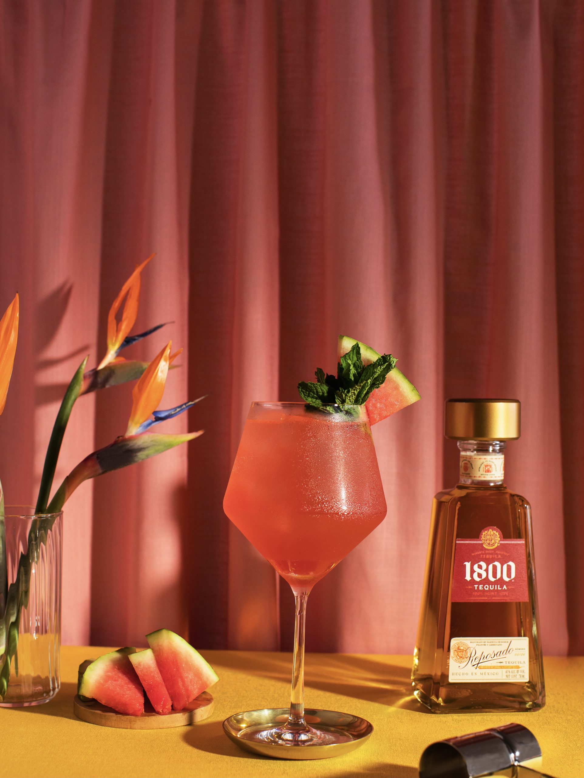 Modo de preparo: Em uma taça de vinho, adicione o 1800 Reposado, o suco de melancia, o aperitivo e a água com gás. Complete a taça com gelo e finalize com o vinho espumante. Mexa delicadamente para incorporar os ingredientes e decore com um buquê de hortelã e uma fatia de melancia.