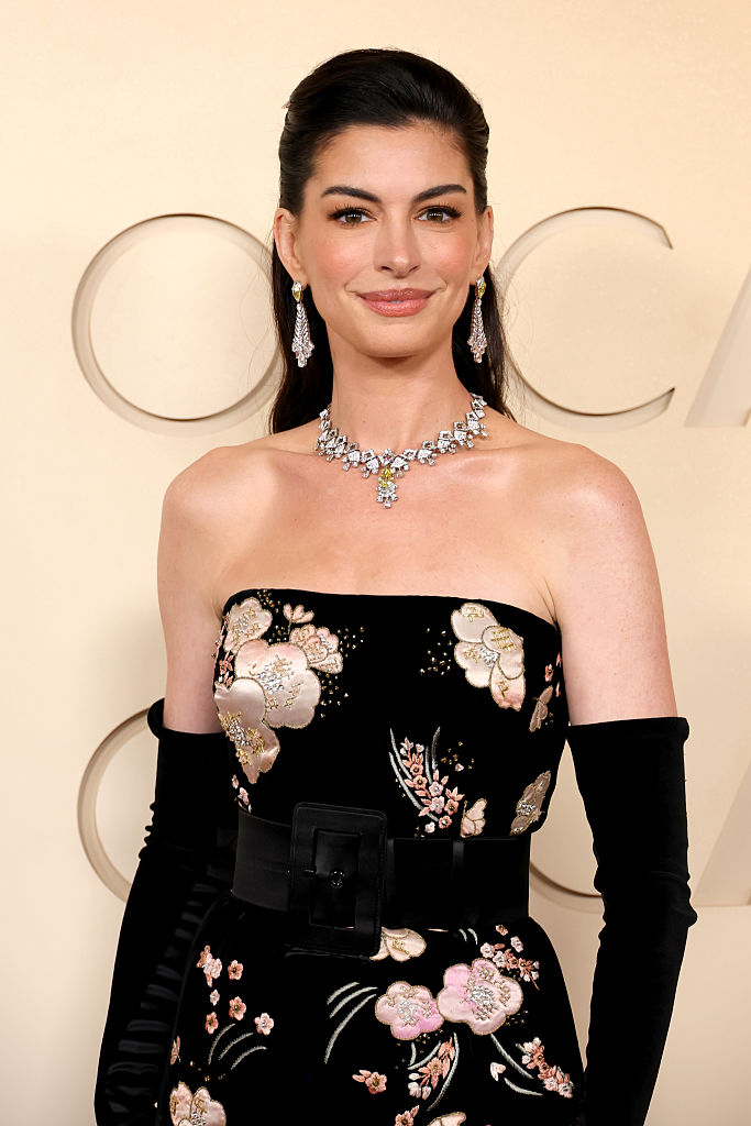 Musa contemporânea de Valentino, Anne Hathaway homenageou o estilista italiano, falecido em janeiro deste ano, no Oscar 2026. A atriz apostou em um vestido preto, sem alças, com estampas florais da maison. Já a maquiagem foi mais básica, com o cabelo meio preso e um leve topete.