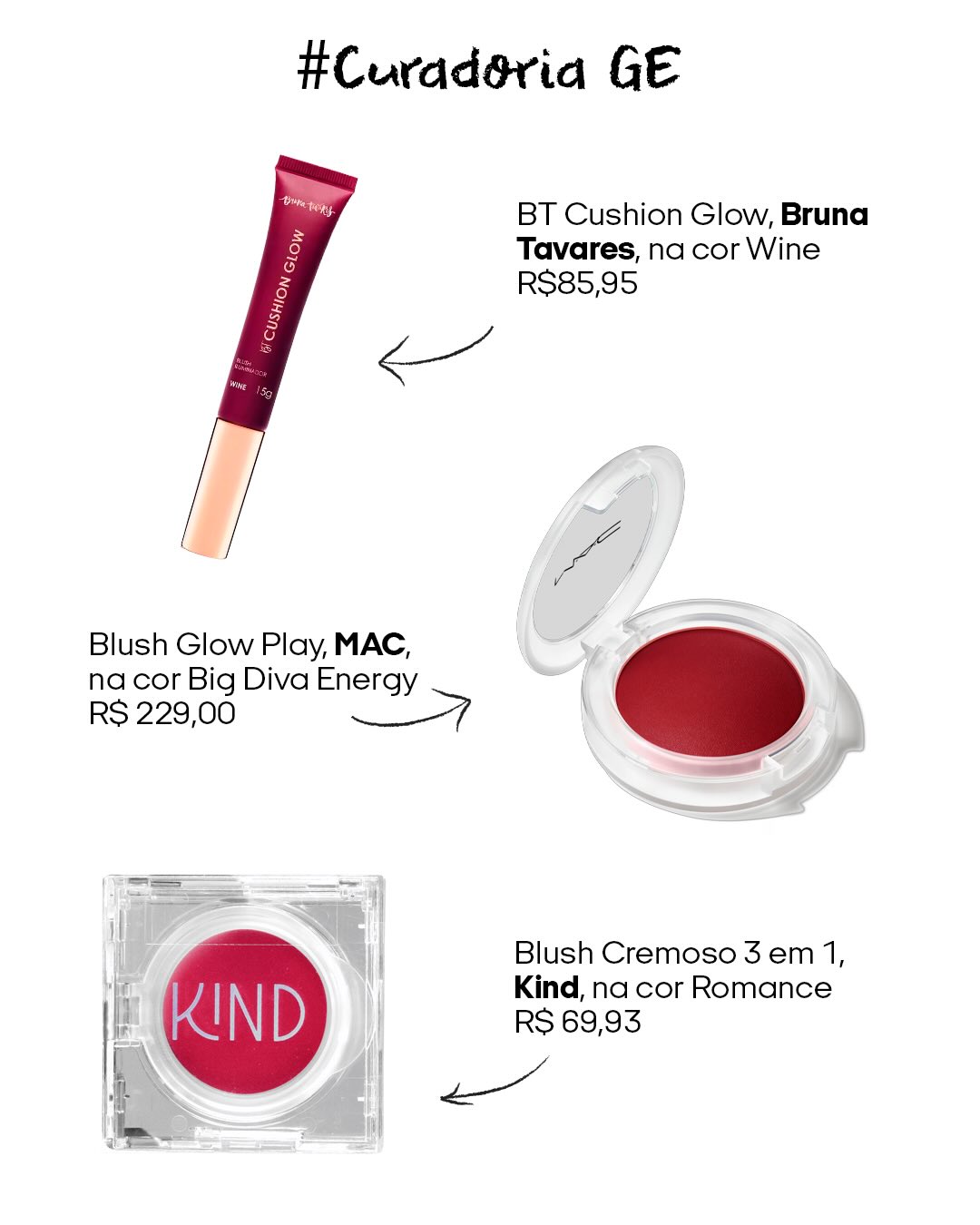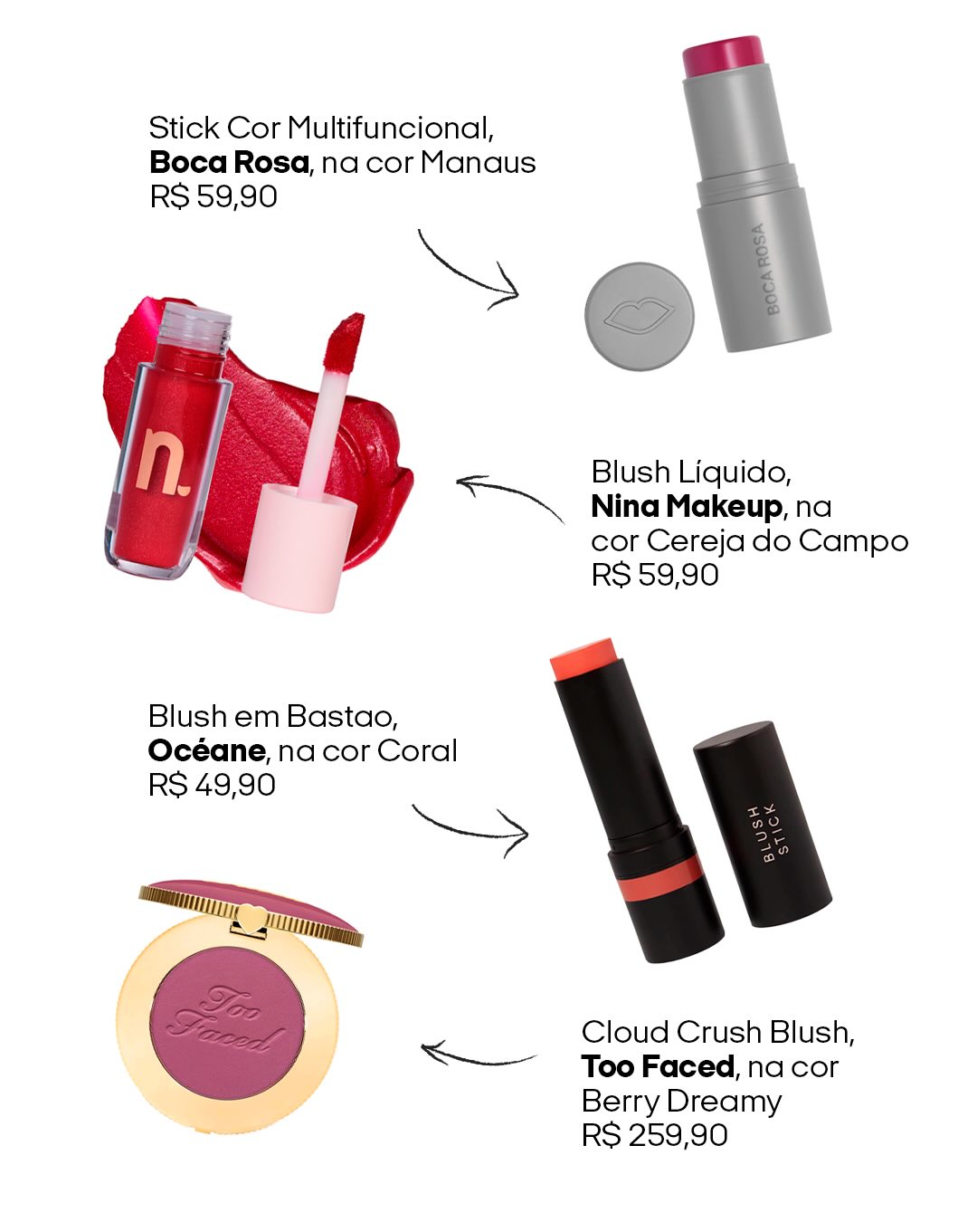 Para esse estilo de blush, escolha cores avermelhadas ou levemente arroxeadas. Já a textura precisa ser cremosa. “Isso garante um acabamento mais real e naturalmente corado”, explica a maquiadora Amanda Mendes.
