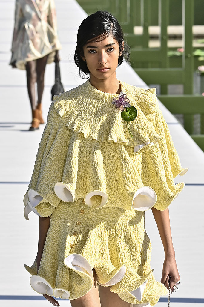 Na passarela, os babados volumosos ganhavam formas orgânicas, quase como pétalas em movimento. Estampas e aplicações florais reforçavam essa atmosfera, enquanto plumas e franjas adicionavam leveza e fluidez às peças.
