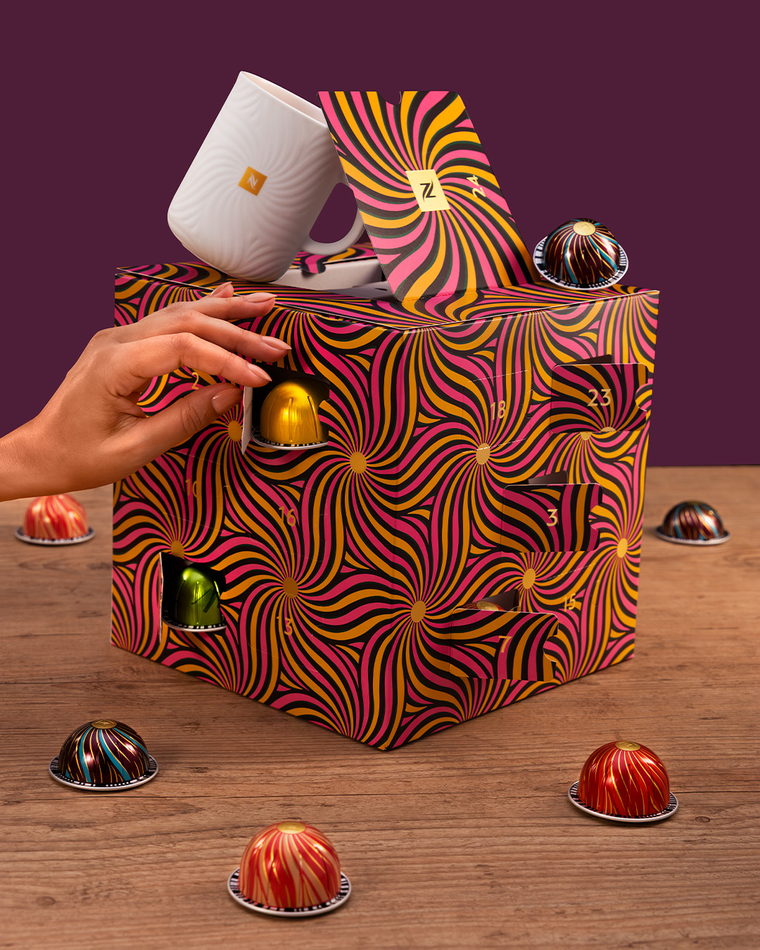 Calendários do Advento:com o design exclusivo de Thandiwe Muriu, o item colecionável traz 24 janelas que convidam a descobrir a cada dia um café, explorando seus aromas e sabores, além de um acessório encantador no final. Disponível para máquinas dos sistemas Original e Vertuo.