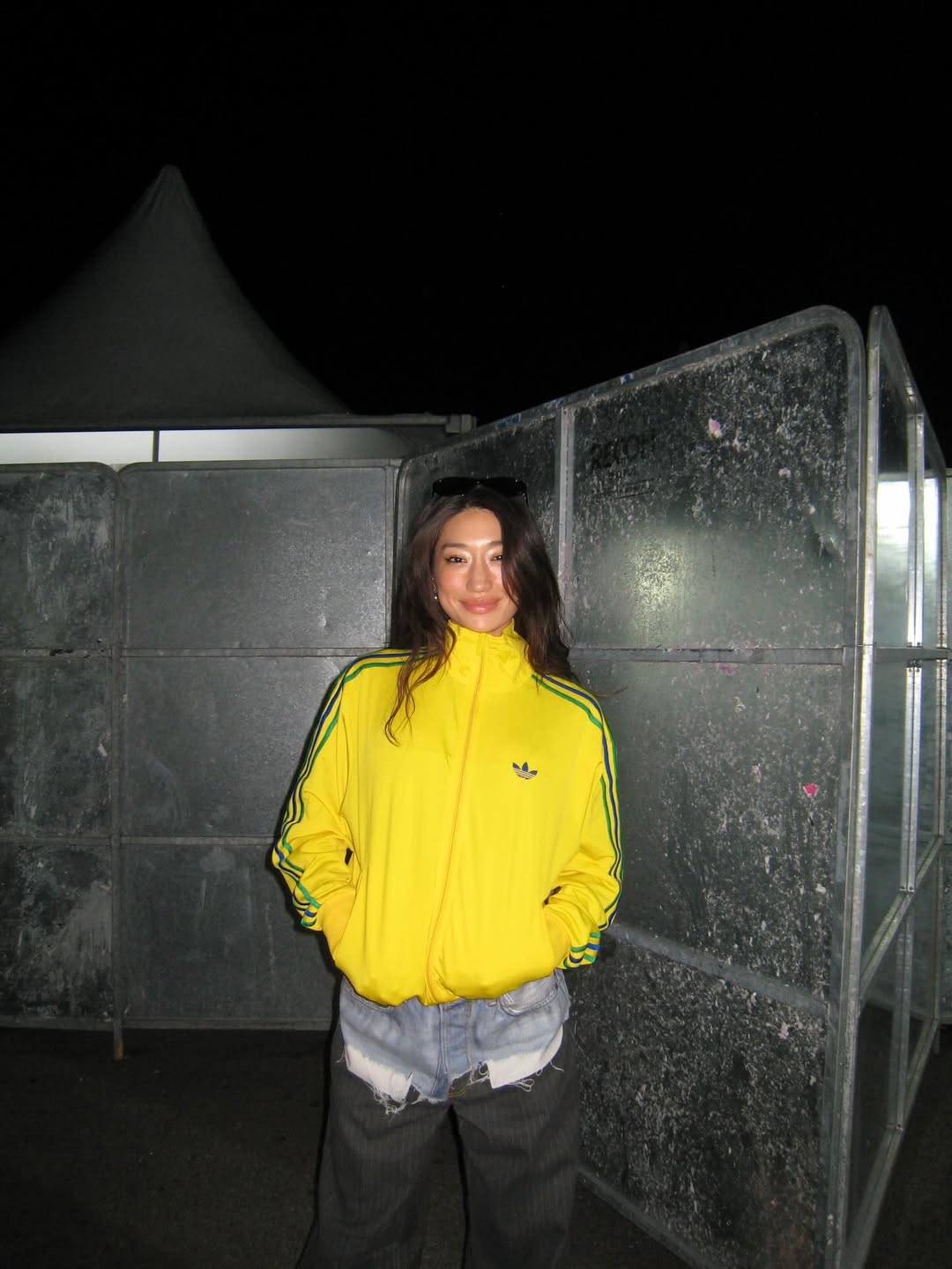 Top preto com biquíni verde e amarelo, combinado com jaqueta da Adidas como peça-chave. Por fim, mistura do jeans com alfaiataria, criando uma camada aparente.
