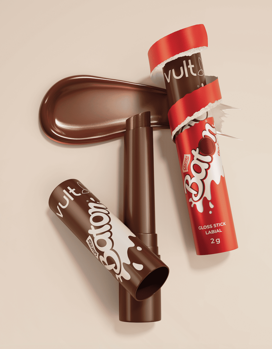 Com a febre da beleza flertando com o universo dos doces, a Vult acaba de anunciar uma collab com Baton, da Garoto (Nestlé), de gloss stick inspirada no chocolate que marcou e ainda marca gerações. A novidade aposta justamente nesta nostalgia, transformando o produto em uma experiência sensorial, com embalagem descascável, textura confortável e brilho espelhado.