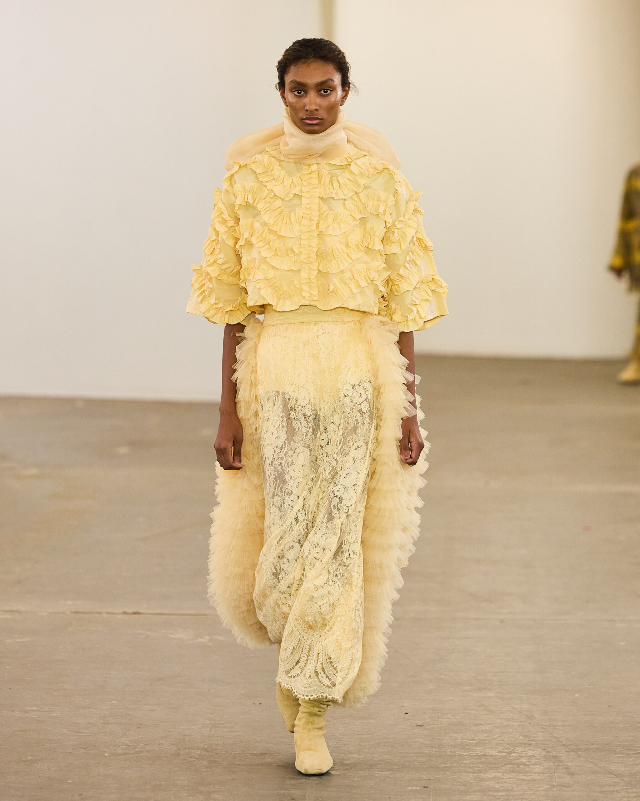 Toda essa intensidade criativa se traduz nas roupas. Na passarela, peças de tecidos encorpados, com volume e muita textura, se destacam. Mesmo em uma coleção de inverno, há espaço até para transparências, bastante renda e os classicos corsets.