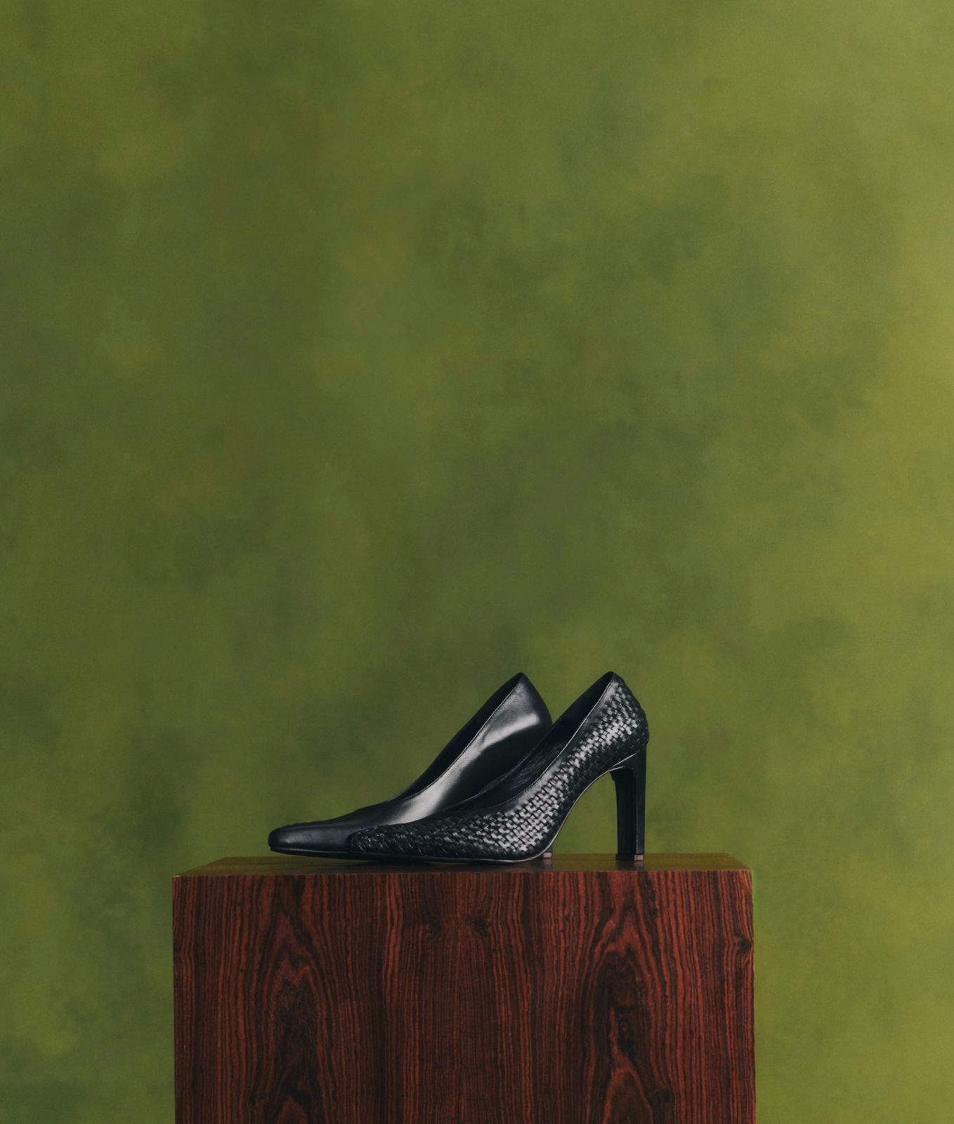 O scarpin surge em leitura contemporânea, com salto retangular e textura trançada em degradê, combinando conforto, design e personalidade. Já a bota, em couro, apresenta ponta quadrada, salto retangular e solado em madeira.