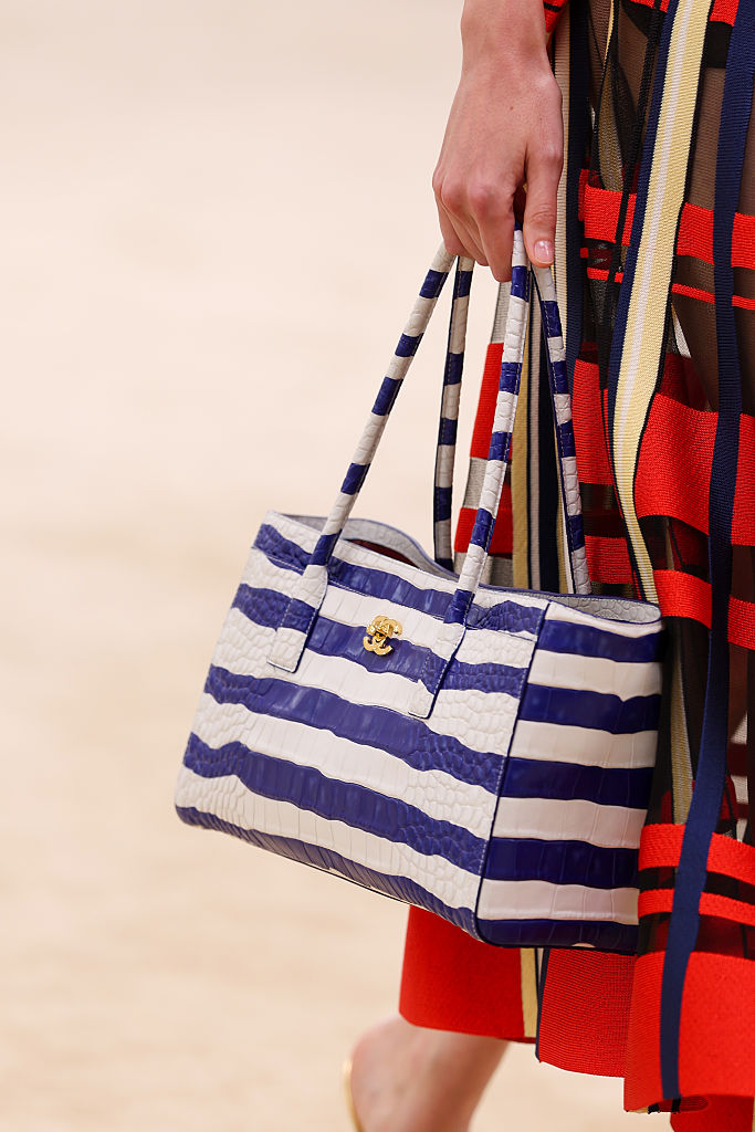 As bolsas pequenas tiveram seu momento no desfile, mas foram as bolsas de praia em versão maxi que roubaram a cena. Se você quer levar tudo e mais um pouco para passar o dia na praia, essa trend é perfeita.