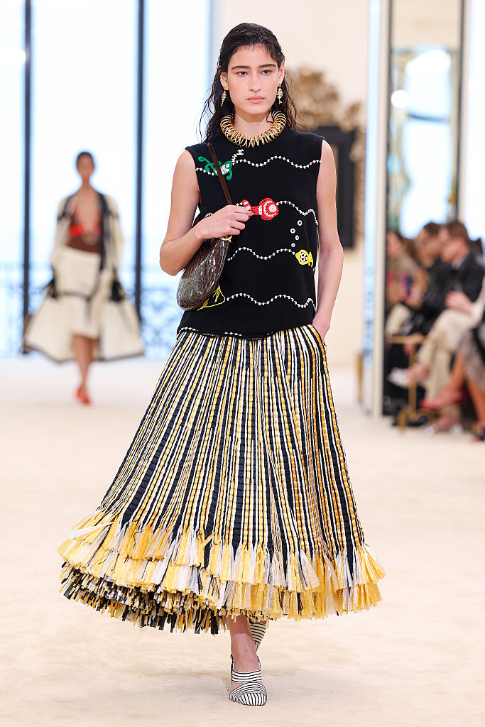 Os detalhes da coleção Cruise 2027 também deram o tom: estrelas-do-mar coloridas em um casaco all black, camisa com estampa de praia e bolsas com peixes.